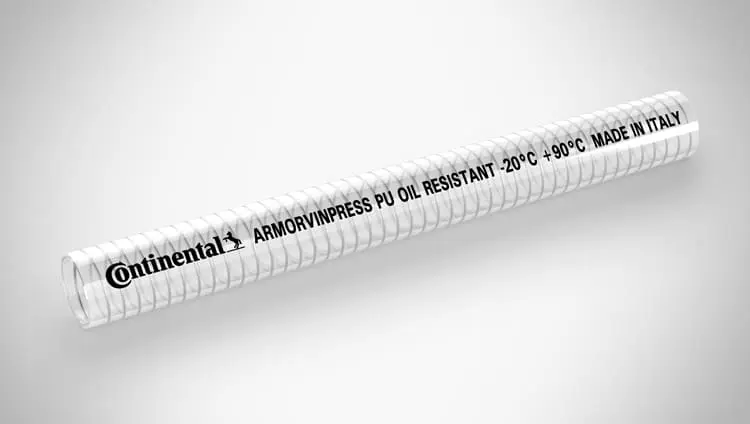 Tubo in PVC con spirale in acciaio zincato incorporata, a passo ridotto, strato interno in PU, per aspirazione e mandata liquidi e aria nell’industria pneumatica, idraulica, oleodinamica e chimica. Conforme a FDA 21 CFR 177.2600 par. “e/f” (alimenti acquosi, alimenti grassi).