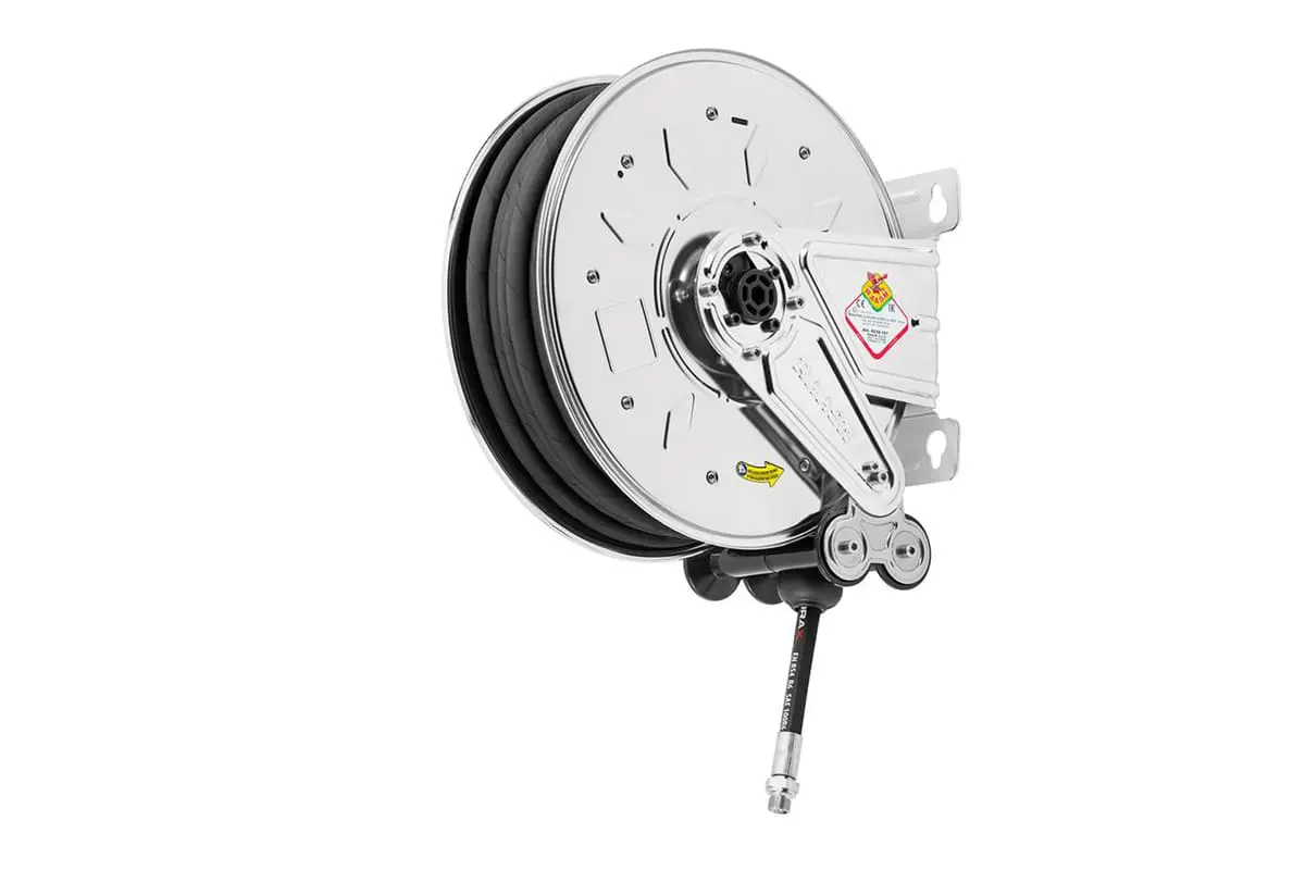 Avvolgitubo in acciaio inox AISI 304, per acqua, 200 bar, tubo in gomma sintetica nera.