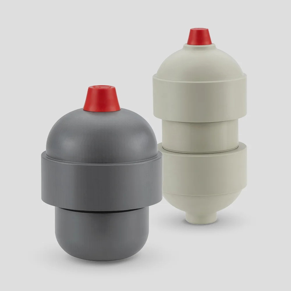 Accumulatori plastici con elemento separatore in gomma; leggeri, per fluidi aggressivi o alimentari, bassa pressione. Particolarmente indicati per gli impianti di trattamento delle acque o di trattamento degli acidi, con esecuzioni in PVC, Polipropilene, CPVC e PVDF. Volumi disponibili fino a 15 litri.