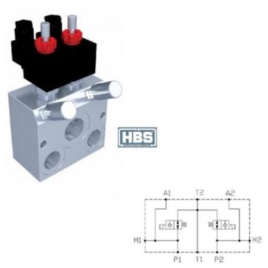 Blocco idraulico con due elettrovalvole normalmente aperte per la messa a scarico di due linee idrauliche.