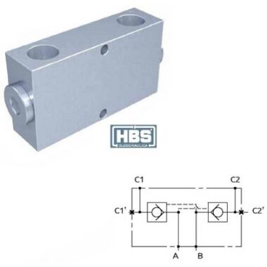 Permette il flusso libero da A verso C1 e da B verso C2, mentre nelle direzioni inverse il flusso è pilotato. Idonea al sostentamento di un carico, non al controllo discesa.