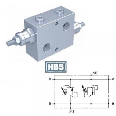 Valvola limitatrice di pressione doppia incrociata con tenuta ad otturatore, con funzione di protezione del circuito da sovrapressioni. Disponibile con due differenti campi di taratura.