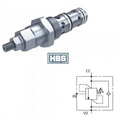 Valvola di bilanciamento a semplice effetto, consigliata per distributori con spole a centro aperto in neutro. Collegare all’impianto come da schema. La valvola permette: flusso libero da V2 verso C1, sostentamento del carico con distributore in neutro o a pompa ferma, controllo del movimento di discesa del carico a seguito del pilotaggio della valvola pilotaggio, protezione da sovrapressioni nel cilindro.