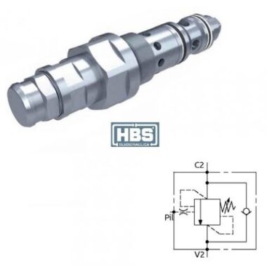 Valvola di bilanciamento a semplice effetto, consigliata per distributori con spole a centro aperto in neutro. Collegare all’impianto come da schema. La valvola permette: flusso libero da V2 verso C1, sostentamento del carico con distributore in neutro o a pompa ferma, controllo del movimento di discesa del carico a seguito del pilotaggio della valvola pilotaggio, protezione da sovrapressioni nel cilindro.