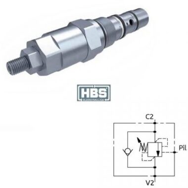 Valvola di bilanciamento a semplice effetto, consigliata per distributori con spole a centro aperto in neutro. Collegare all’impianto come da schema. La valvola permette: flusso libero da V2 verso C2, sostentamento del carico con distributore in neutro o a pompa ferma, controllo del movimento di discesa del carico a seguito del pilotaggio della valvola pilotaggio, protezione da sovrapressioni nel cilindro.