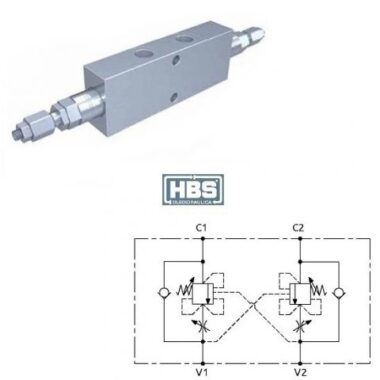 La valvola permette il flusso libero da V1>C1 o V2>C2 e il controllo nel verso opposto tramite l’azione della pressione di pilotaggio. Assicura il blocco del carico con distributore in neutro o a pompa ferma (trafilamento max. 5 gocce/min) e permette di scaricare i picchi di pressione se la spola del distributore è a centro aperto. Tarare ad almeno 1,3 volte la pressione massima indotta dal carico. Eventuali contropressioni sullo scarico aumentano la pressione di taratura e di pilotaggio richiesta per pilotare la valvola.