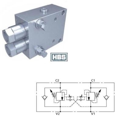 La valvola permette il flusso libero da V1>C1 o V2>C2 e il controllo nel verso opposto tramite l’azione della pressione di pilotaggio. Assicura il blocco del carico con distributore in neutro o a pompa ferma (trafilamento max. 5 gocce/min) e permette di scaricare i picchi di pressione se la spola del distributore è a centro aperto. Tarare ad almeno 1,3 volte la pressione massima indotta dal carico. Eventuali contropressioni sullo scarico aumentano la pressione di taratura e di pilotaggio richiesta per pilotare la valvola.