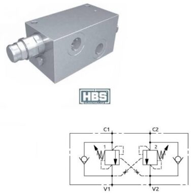 La valvola permette il flusso libero da V1>C1 o V2>C2 e il controllo nel verso opposto tramite l’azione della pressione di pilotaggio. Assicura il blocco del carico con distributore in neutro o a pompa ferma (trafilamento max. 5 gocce/min) e permette di scaricare un picco di pressione se la spola del distributore è a centro aperto. Tarare ad almeno 1,3 volte la pressione massima indotta dal carico. Eventuali contropressioni sullo scarico aumentano la pressione di taratura e di pilotaggio richiesta per pilotare la valvola. Sulla linea di pilotaggio una strozzatura unidirezionale regolabile permette di smorzare il pilotaggio della valvola.