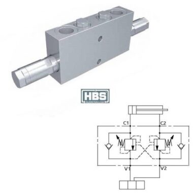 La valvola permette il flusso libero da V1>C1 o V2>C2 e il controllo nel verso opposto tramite l’azione della pressione di pilotaggio. Assicura il blocco del carico con distributore in neutro o a pompa ferma (trafilamento max. 5 gocce/min) e permette di scaricare i picchi di pressione se la spola del distributore è a centro aperto. Tarare ad almeno 1,3 volte la pressione massima indotta dal carico. Eventuali contropressioni sullo scarico aumentano la pressione di taratura e di pilotaggio richiesta per pilotare la valvola.