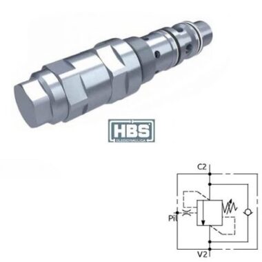 Valvola di bilanciamento a semplice effetto, consigliata per distributori con spole a centro aperto in neutro. Collegare all’impianto come da schema. La valvola permette: flusso libero da V2 verso C2, sostentamento del carico con distributore in neutro o a pompa ferma, controllo del movimento di discesa del carico a seguito del pilotaggio della valvola pilotaggio, protezione da sovrapressioni nel cilindro.