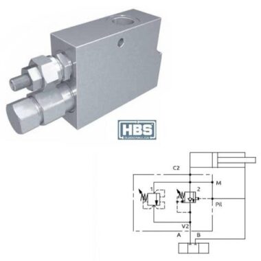 Valvola di bilanciamento a semplice effetto. La valvola di controllo è ad area differenziale zero e la sua apertura non dipende dalla pressione del carico, ma solo dalla pressione di pilotaggio. Consigliata per distributori con spole a centro chiuso in neutro. Collegare all’impianto come da schema. La valvola permette: flusso libero da V2 verso C2, sostentamento del carico con distributore in neutro o a pompa ferma, controllo del movimento di discesa del carico a seguito del pilotaggio della valvola pilotaggio, protezione da sovrappressioni nel cilindro, se sull’elemento distributore è montata una valvola imitatrice di pressione.