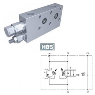 Valvola di bilanciamento a semplice effetto. La valvola di controllo è ad area differenziale zero e la sua apertura non dipende dalla pressione del carico, ma solo dalla pressione di pilotaggio. Consigliata per distributori con spole a centro chiuso in neutro. Collegare all’impianto come da schema. La valvola permette: flusso libero da V2 verso C2, sostentamento del carico con distributore in neutro o a pompa ferma, controllo del movimento di discesa del carico tramite il pilotaggio della valvola, protezione da sovrappressioni nel cilindro, se sull’elemento distributore è montata una valvola limitatrice di pressione.