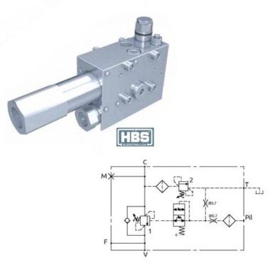 Valvola di bilanciamento a semplice effetto, consigliata per distributori con spole a centro aperto in neutro. Collegare all’impianto come da schema. La valvola permette: flusso libero da V verso C, sostentamento del carico con distributore in neutro o a pompa ferma, controllo del movimento di discesa del carico a seguito del pilotaggio della valvola pilotaggio, protezione da sovrappressioni nel cilindro. Nella valvola è stata aggiunta la funzione di anti-shock fra cilindro e valvola, con scarico al serbatoio.