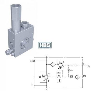 Valvola di bilanciamento a semplice effetto, consigliata per distributori con spole a centro aperto in neutro. Collegare all’impianto come da schema. La valvola permette: flusso libero da V verso C, sostentamento del carico con distributore in neutro o a pompa ferma, controllo del movimento di discesa del carico tramite il pilotaggio della valvola, protezione da sovrappressioni nel cilindro. Nella valvola è stata aggiunta la funzione di anti-shock fra cilindro e valvola, con scarico al serbatoio.