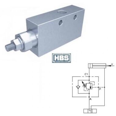Valvola di bilanciamento a semplice effetto, consigliata per distributori con spole a centro aperto in neutro. Collegare all’impianto come da schema. La valvola permette: flusso libero da A verso C1, sostentamento del carico con distributore in neutro o a pompa ferma, controllo del movimento di discesa del carico a seguito del pilotaggio della valvola pilotaggio, protezione da sovrapressioni nel cilindro.
