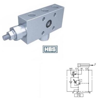 Valvola di bilanciamento a semplice effetto, consigliata per distributori con spole a centro aperto in neutro. Collegare all’impianto come da schema. La valvola permette: flusso libero da A verso C1, sostentamento del carico con distributore in neutro o a pompa ferma, controllo del movimento di discesa del carico a seguito del pilotaggio della valvola pilotaggio, protezione da sovrappressioni nel cilindro. La valvola integra la valvola paracadute sull’attacco M.