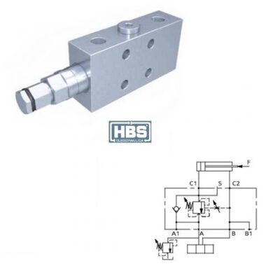 Valvola di bilanciamento a semplice effetto, consigliata per distributori con spole centro chiuso in neutro. Collegare all’impianto come da schema. La valvola permette: flusso libero da A verso C1, sostentamento del carico con distributore in neutro o a pompa ferma, controllo del movimento di discesa del carico a seguito del pilotaggio della valvola pilotaggio, protezione da sovrappressioni nel cilindro, se sull’elemento del distributor è montata una valvola limitatrice di pressione ausiliaria, da tarare almeno 15 bar in meno rispetto alla valvola.