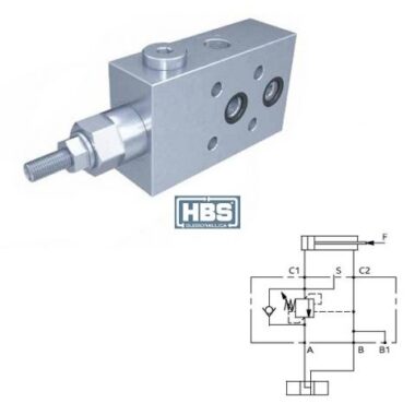 Valvola di bilanciamento a semplice effetto, consigliata per distributori con spole a centro aperto in neutro. Collegare all’impianto come da schema. La valvola permette: flusso libero da A verso C1, sostentamento del carico con distributore in neutro o a pompa ferma, controllo del movimento di discesa del carico a seguito del pilotaggio della valvola pilotaggio, protezione da sovrappressioni nel cilindro.