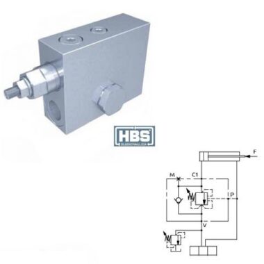 Valvola di bilanciamento a semplice effetto, consigliata per distributori con spole centro chiuso in neutro. Collegare all’impianto come da schema. La valvola permette: flusso libero da V verso C1, sostentamento del carico con distributore in neutro o a pompa ferma, controllo del movimento di discesa del carico a seguito del pilotaggio della valvola pilotaggio, protezione da sovrappressioni nel cilindro, se sull’elemento del distributore è montata una valvola limitatrice di pressione ausiliaria tarata 15 bar in meno rispetto alla valvola.