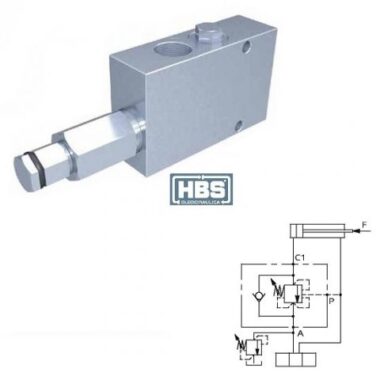Valvola di bilanciamento a semplice effetto, consigliata per distributori con spole centro chiuso in neutro. Collegare all’impianto come da schema. La valvola permette: flusso libero da A verso C1, sostentamento del carico con distributore in neutro o a pompa ferma, controllo del movimento di discesa del carico a seguito del pilotaggio della valvola pilotaggio, protezione da sovrappressioni nel cilindro, se sull’elemento del distributore è montata una valvola limitatrice di pressione ausiliaria, da tarare almeno 15 bar in meno rispetto alla valvola.