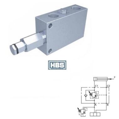 Valvola di bilanciamento a semplice effetto, consigliata per distributori con spole centro chiuso in neutro. Collegare all’impianto come da schema. La valvola permette: flusso libero da A verso C1, sostentamento del carico con distributore in neutro o a pompa ferma, controllo del movimento di discesa del carico a seguito del pilotaggio della valvola pilotaggio, protezione da sovrappressioni nel cilindro, se sull’elemento del distributore è montata una valvola limitatrice di pressione ausiliaria, da tarare almeno 15 bar in meno rispetto alla valvola.