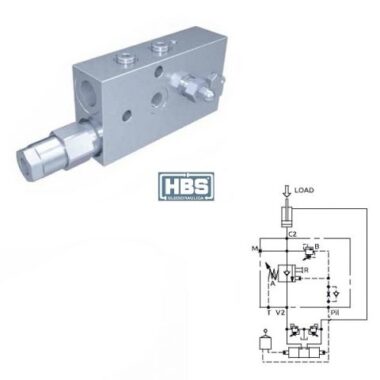 Collegare all’impianto come da schema. Il pilotaggio della valvola è prelevato dai manipolatori di comando distributore e la valvola permette: il flusso libero da V2 verso C2, il sostentamento del carico con distributore in neutro o pompa ferma, controllo della discesa a valvola pilotata e protezione contro sovrappressioni nel cilindro. L’attacco T deve essere collegato direttamente a scarico.