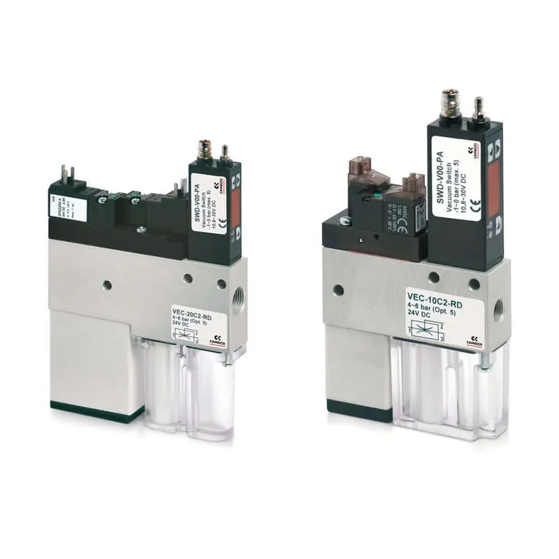 Generatori di vuoto con elettrovalvole di comando (per aspirazione e soffio) e sistema di monitoraggio (vacuostato) integrati. Gli eiettori compatti della serie VEC permettono il controllo delle funzioni di aspirazione e soffiaggio senza l’utilizzo di elettrovalvole esterne al sistema.