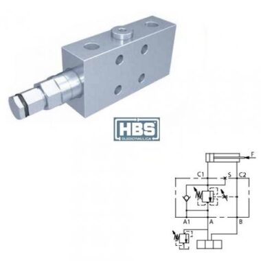 Valvola di bilanciamento a semplice effetto, consigliata per distributori con spole centro chiuso in neutro. Collegare all’impianto come da schema. La valvola permette: flusso libero da A verso C1, sostentamento del carico con distributore in neutro o a pompa ferma, controllo del movimento di discesa del carico a seguito del pilotaggio della valvola pilotaggio, protezione da sovrappressioni nel cilindro, se sull’elemento del distributore è montata una valvola limitatrice di pressione ausiliaria, da tarare almeno 15 bar in meno rispetto alla valvola.