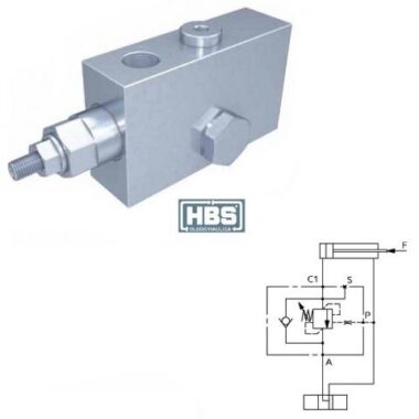 Valvola di bilanciamento a semplice effetto, consigliata per distributori con spole a centro aperto in neutro. Collegare all’impianto come da schema. La valvola permette: flusso libero da A verso C1, sostentamento del carico con distributore in neutro o a pompa ferma, controllo del movimento di discesa del carico a seguito del pilotaggio della valvola pilotaggio, protezione da sovrapressioni nel cilindro.