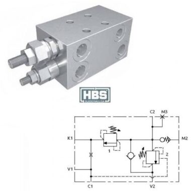 Valvola di bilanciamento a semplice effetto, consigliata per distributori con spole a centro aperto in neutro. Collegare all’impianto come da schema. La valvola permette: flusso libero da V2 verso C2, sostentamento del carico con distributore in neutro o a pompa ferma, controllo del movimento di discesa del carico tramite il pilotaggio della valvola, protezione da sovrappressioni nel cilindro.